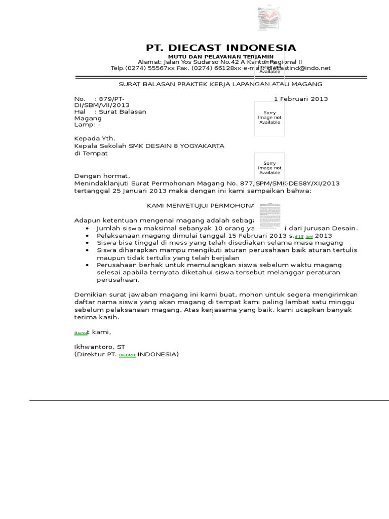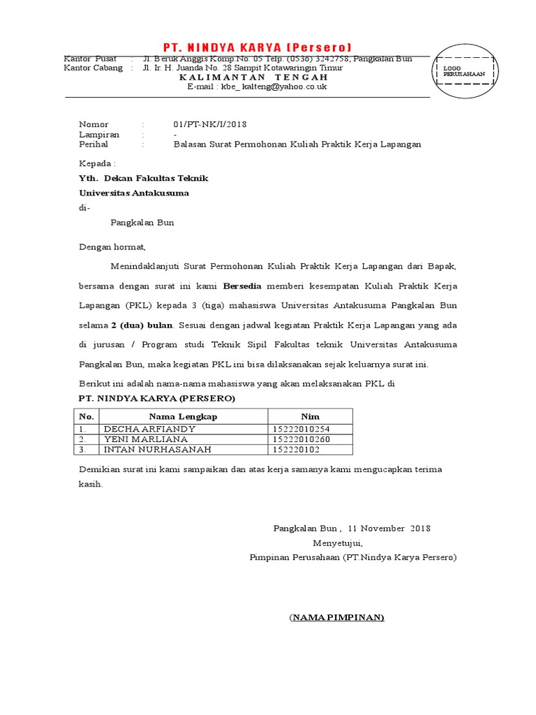 Sehubung dengan surat saudara nomor.057/dir/bi/pkl/pulmed/vi/11 tanggal 21 desember 2011 perihal permohonan melakukan praktek kerja lapangan atas nama: Mendapat surat balasan yang menyatakan bahwa perusahaan pt trans marga jateng mengijinkan mahasiswa. Contoh isi balasan surat lamaran kerja surat kerja surat cinta. Savesave surat balasan pkl for later. Contoh surat, surat penarikanfull description.